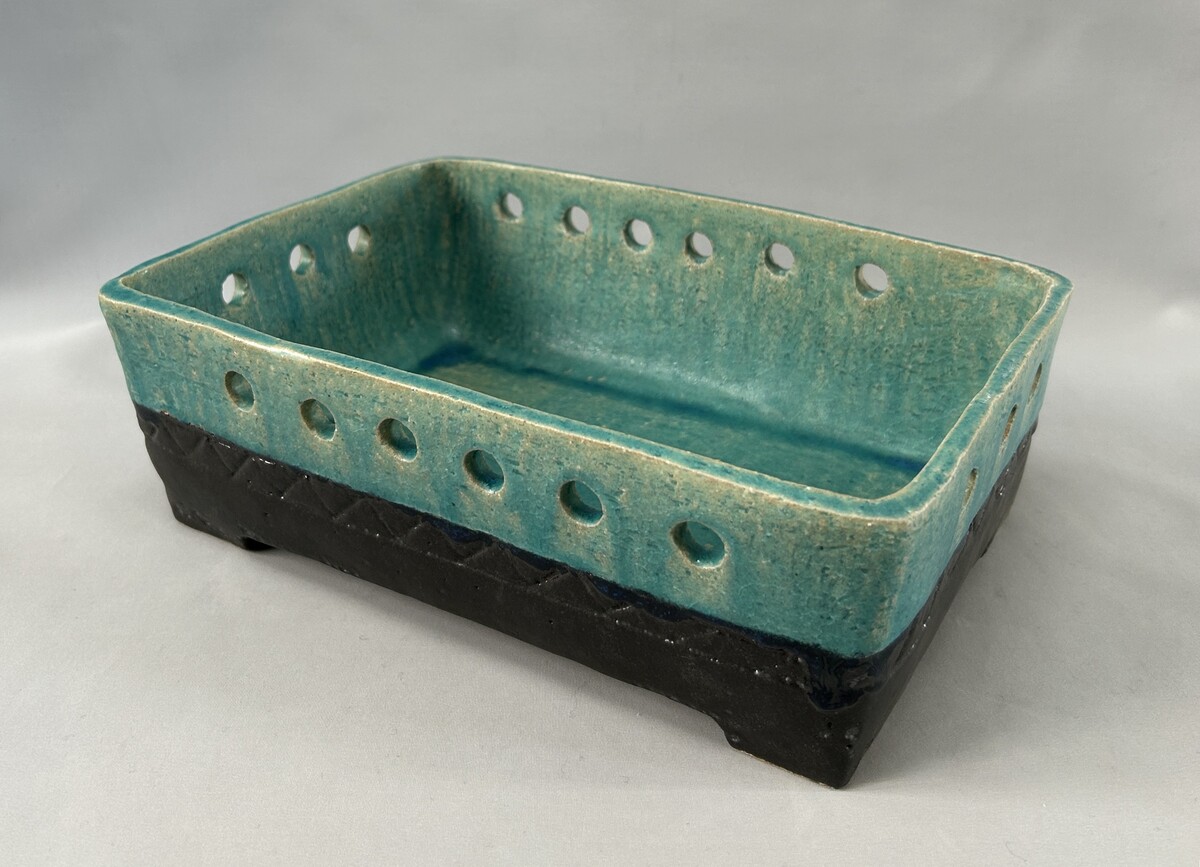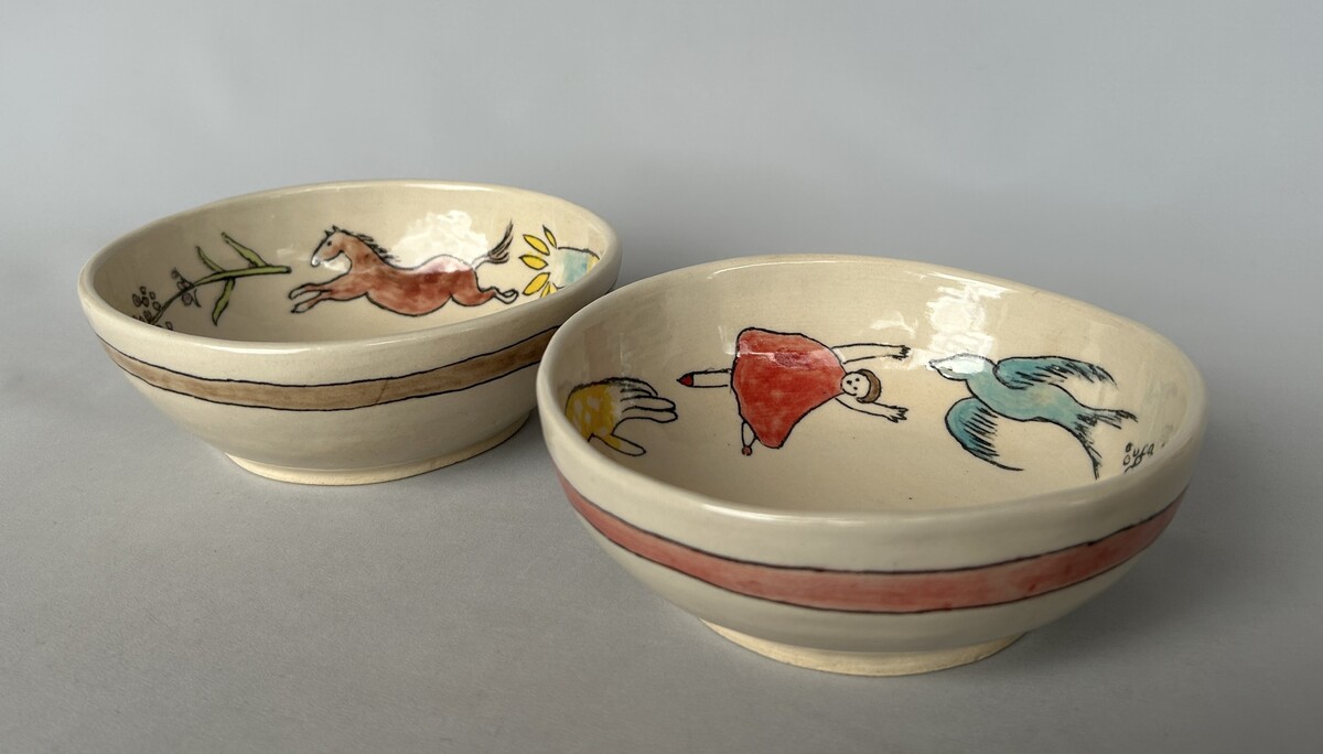 根本さんは文様を低下度のトルコの古典作品に倣い、白化粧した素焼素地に下絵の具で輪郭線を描き、色がはっきり出るように釉薬をしっかりと筆置きしました。