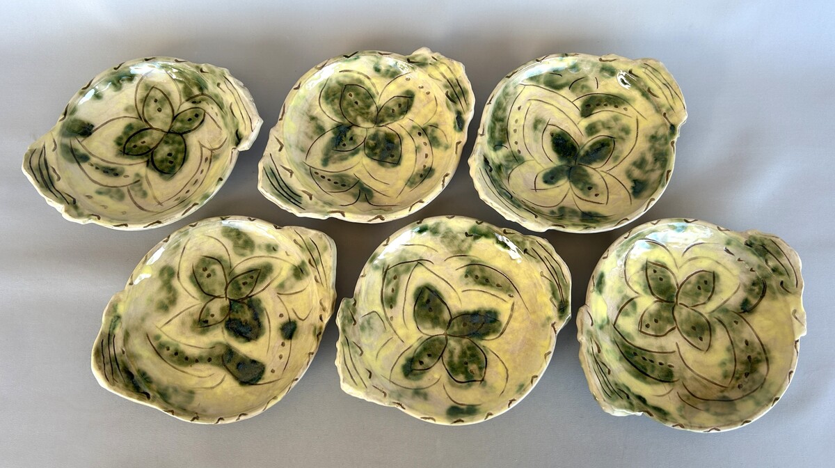 森さんは白化粧をした生地に輪郭線を掻き落とし、釉はあえてムラにはみ出す様に筆置きしています。釉彩は文様によって輪郭線や釉薬の塗り方を変えると作品の印象が変わります。