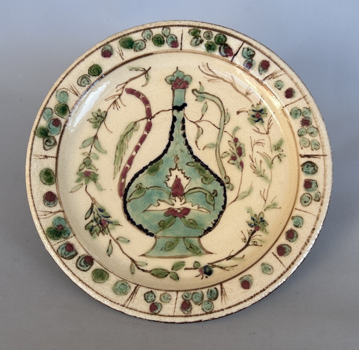 根本さんは文様を低下度のトルコの古典作品に倣い、白化粧した素焼素地に下絵の具で輪郭線を描き、色がはっきり出るように釉薬をしっかりと筆置きしました。